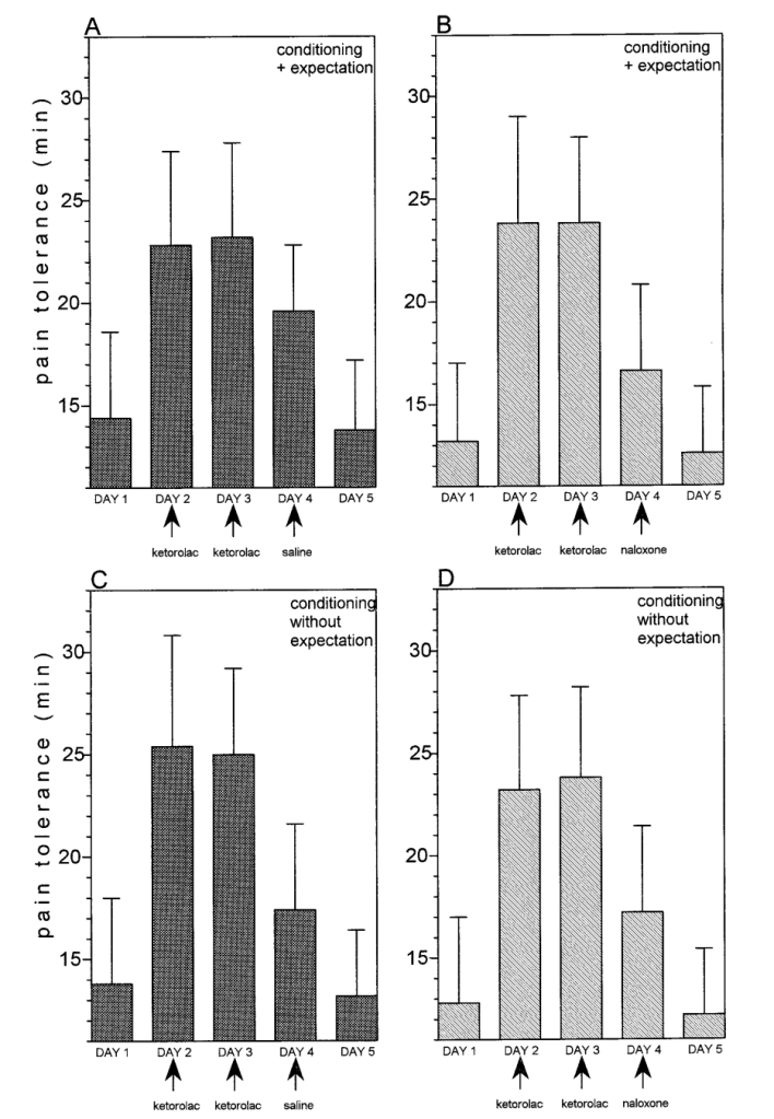 However, if instead of a saline injection said to be morphine, subjects were given a naloxone injection, their morphine conditioning did not work, according to these authors, and pain tolerance again went back to baseline. When conditioned with the non-opioid drug ketorolac, however, the (conditioned) placebo response was not extinguished with naloxone, and subjects could squeeze the hand exerciser as long as they could with a saline injection. Here are the graphs for morphine conditioning – baseline is day 1 (no treatment), days 2 and 3 are morphine conditioning (they squeeze the squeezer for a long time), day 4 is either saline or naloxone described as either morphine (+ expectation) or an antibiotic (without expectation), and day 5 is baseline: