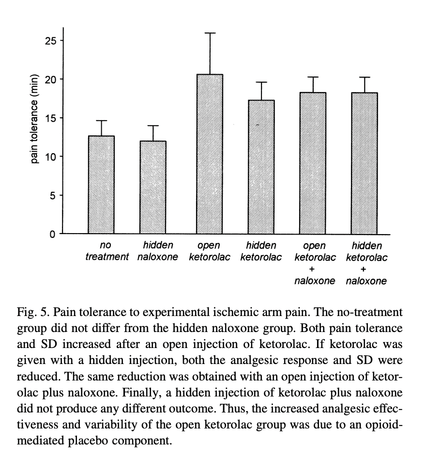 open injection of ketorolac plus naloxone were exactly the same.” (Although I must say, visually, open ketorolac plus naloxone looks about in between the open ketorolac and hidden ketorolac.) The addition of naloxone seems to remove the difference between the open and hidden injections in their sample, thereby, in this tedious and roundabout way, demonstrating that it extinguished the placebo effect component of a non-opioid drug.