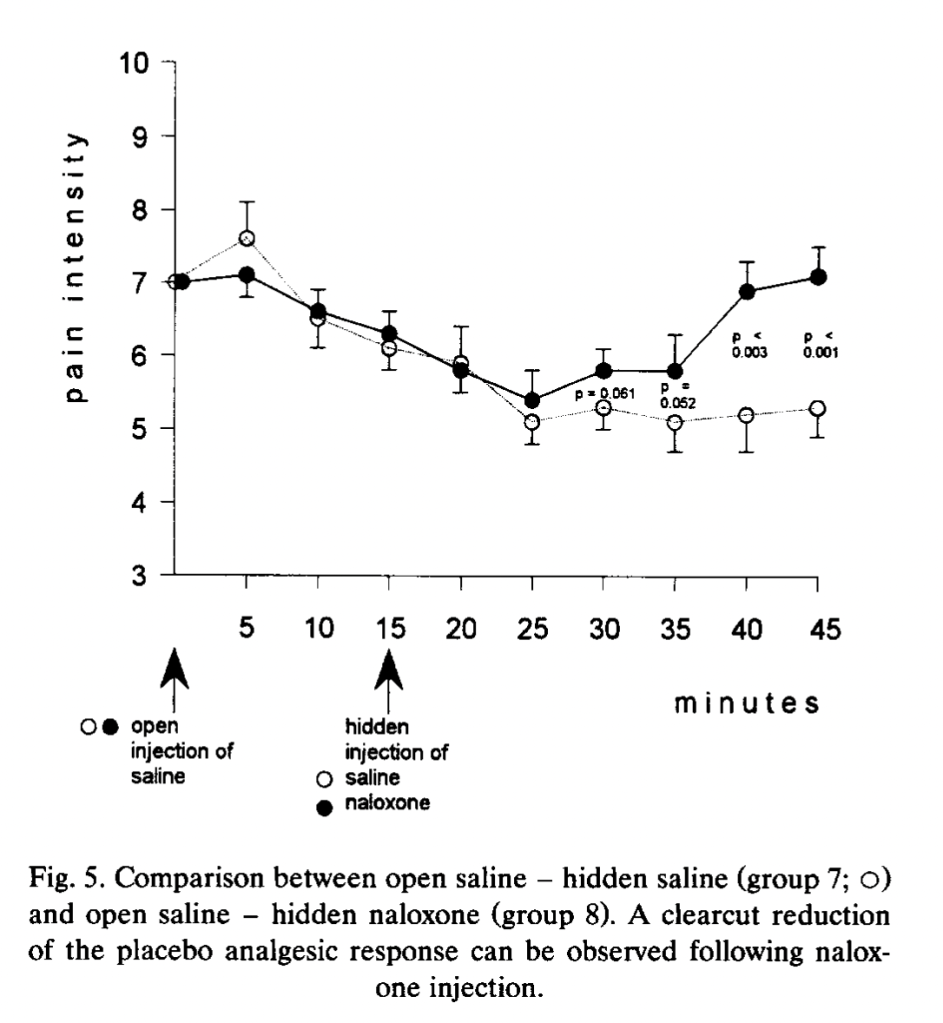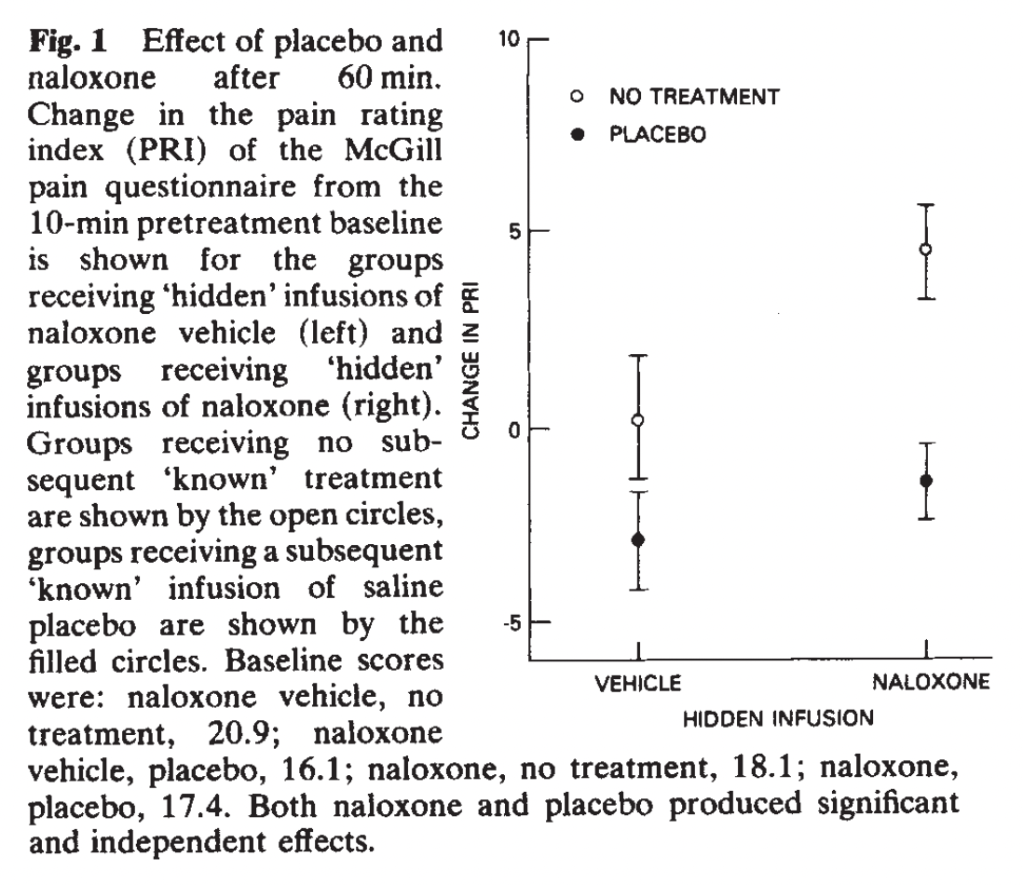 Surprisingly, despite (or because of?) their careful study design and practices, these authors don’t produce a significant placebo effect, reporting instead a very realistic -.5 points on a 100-point scale with a 95% CI of -5.8 to 4.8. β-endorphin levels were also not affected by the placebo billed as fentanyl, compared to honest placebo. And there was no effect of naloxone on the (nonexistent) placebo effect.