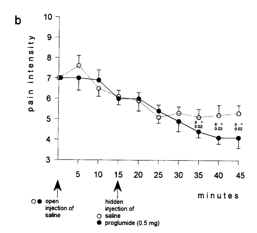 The second study is Amanzio et al. 2001, Response variability to analgesics: a role for non-specific activation of endogenous opioids, also with Benedetti as a co-author. The authors seem to throw the results of the previous study in the garbage, now attempting to show that endogenous opioids are involved in pain relief from ketorolac, too. With a study design that I personally find very tedious, they start with a population of clinical pain patients recovering from thoracic surgery. They found that the dose of drugs needed to achieve a 50% reduction in self-reported pain was much higher when the injection was open (in view of the patient), rather than hidden. As someone who doubts that pain intensity reports are a pure measure of pain experience, and have at least some component of politeness, roleplaying, and judgment of situational appropriateness, it is not very surprising that patients who are aware they have been treated report less pain that patients who are not aware of any treatment. These authors interpret this as part of the placebo effect. Specifically, they say, “the difference between open and hidden [doses to relieve 50% of pain] may be taken as a measure of the placebo effect.”