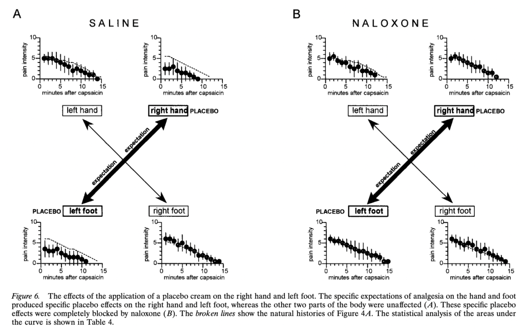 Expectations of Analgesia, by Benedetti et al. (1999). Here we get a break from the tourniquets and start doing subcutaneous injection of capsaicin into various body parts (hands and feet). Subjects were treated with a placebo cream that they were told was a powerful anesthetic, but only on one body part. “The specific expectation of analgesia on the left hand produced a placebo