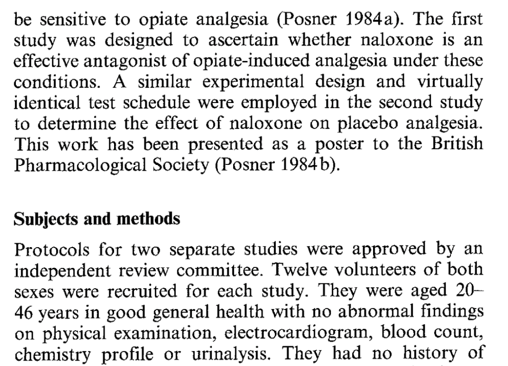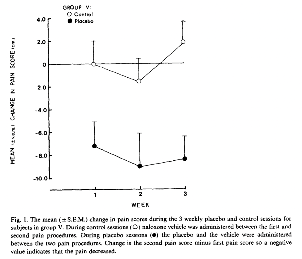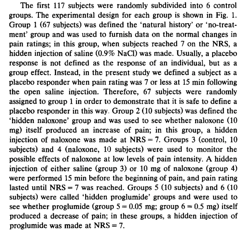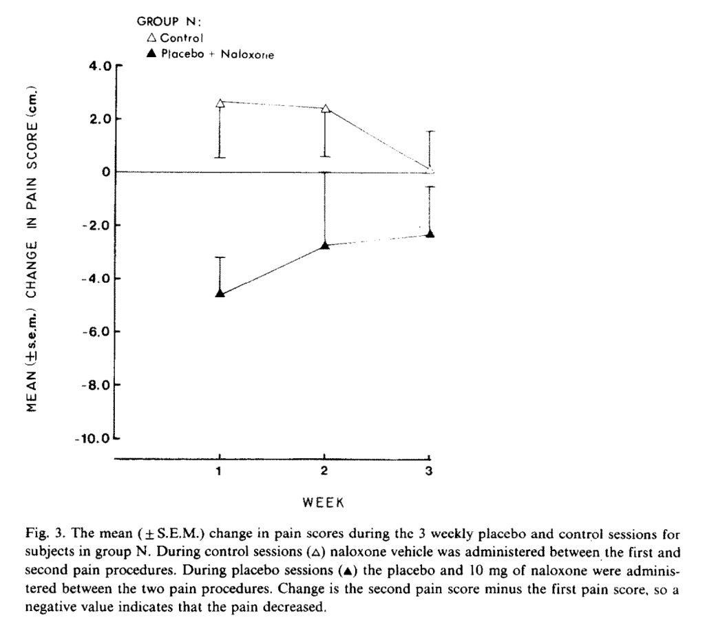 The authors also had a group of 20 subjects who received lidocaine cream rather than placebo, “to allow the double-blind design.” Unfortunately, the “natural history” control group is not reported to receive any kind of cream, so the “placebo effect” was that not just of suggestion of powerful pain relief, but whatever the cream itself may have contributed. Again, there was no effect of naloxone on the non-cream-treated natural history control group.