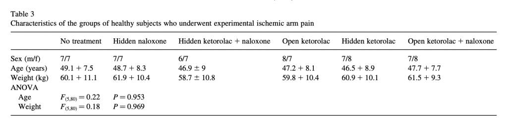 They also show that their subjects’ time in the tourniquet varied more in the open ketorolac-no naloxone condition than in the other conditions, suggesting that part of the variance is placebo effect, and naloxone removes this: