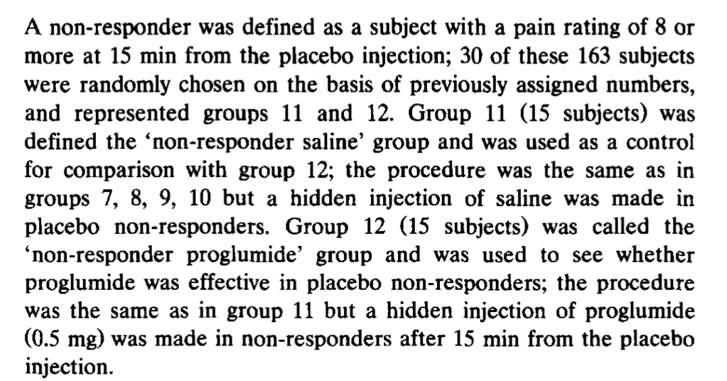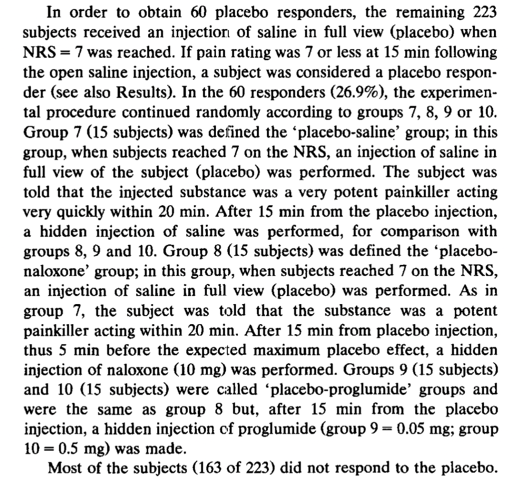 Interestingly, they construct a group of “placebo responders,” a procedure criticized in the section of the main post called Run In, Wash Out. They say: “In order to obtain 60 placebo responders, the remaining 223 subjects received an injection of saline in full view (placebo) when [a pain intensity rating of] 7 was reached. If pain rating was 7 or less at 15 min following the open saline injection, a subject was considered a placebo responder….Most of the subjects (163 out of 223) did not respond to placebo.” There are also a separate 117 subjects assigned to control groups. These subjects are divided between twelve separate experimental conditions, with between 10 and 67 subjects per condition.
