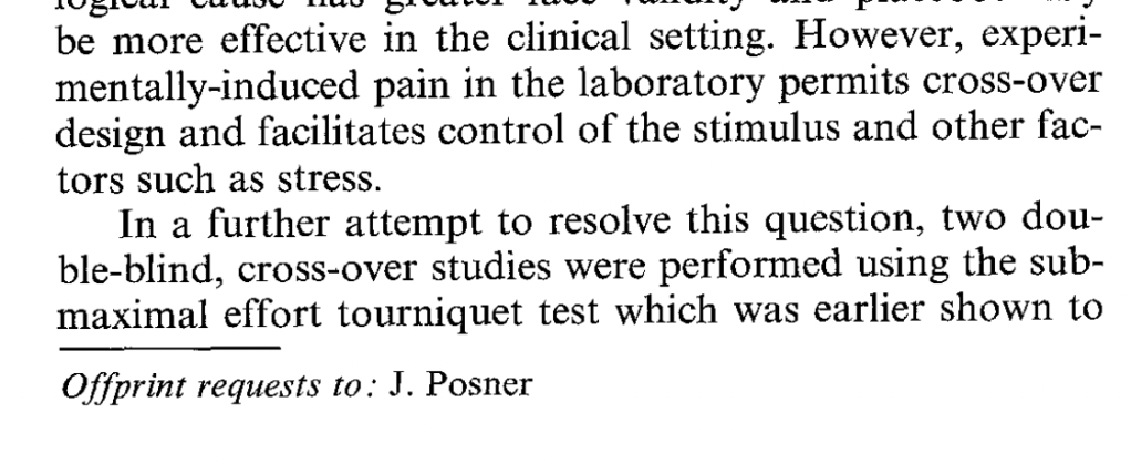 Second-to-last is Posner and Burke (1985), The effects of naloxone on opiate and placebo analgesia in healthy volunteers, another non-Benedetti study. They compare the effects of naloxone on subjects going through a tourniquet/hand squeezer paradigm. Subjects in different groups received a capsule containing either the opioid drug dipipanone, a lactose placebo, codeine, or no capsule. They also received an infusion of either naloxone or saline, administered by a pump but not hidden from the subject (although whether it contained saline or naloxone was hidden).