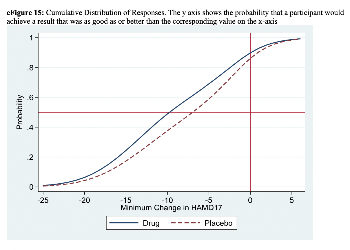 Tangent: There are some other claims in the Stone et al. (2022) analysis that I will not get into detail about here, but one claim that has gotten a lot of attention is that Stone et al. find a latent distribution within the data that they label “Large,” having a 16-point mean improvement from baseline, and further find that 24.5% of drug-treated, vs only 9.6% of placebo-treated individuals fall within this latent distribution. This has been incorrectly interpreted as meaning that the drugs give a 15% greater chance for large improvement (e.g. Newsweek, “Antidepressants Work Better Than Sugar Pills Only 15 Percent of the Time“), but Stone et al.’s own supplementary figure shows that even this depressing mischaracterization is too optimistic: