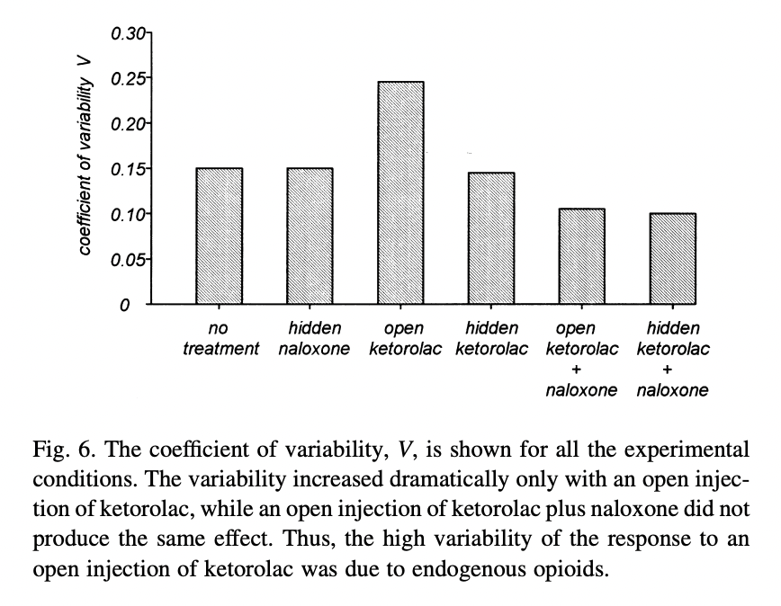 They also show that their subjects’ time in the tourniquet varied more in the open ketorolac-no naloxone condition than in the other conditions, suggesting that part of the variance is placebo effect, and naloxone removes this: