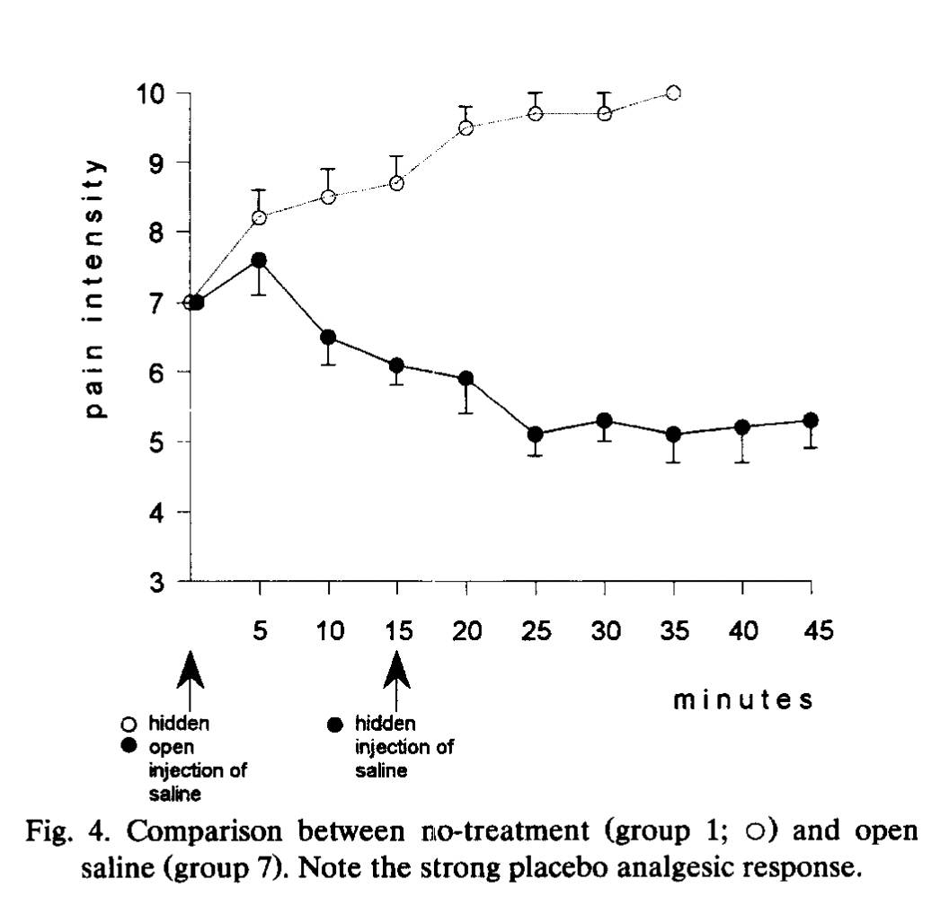 The second study is Amanzio et al. 2001, Response variability to analgesics: a role for non-specific activation of endogenous opioids, also with Benedetti as a co-author. The authors seem to throw the results of the previous study in the garbage, now attempting to show that endogenous opioids are involved in pain relief from ketorolac, too. With a study design that I personally find very tedious, they start with a population of clinical pain patients recovering from thoracic surgery. They found that the dose of drugs needed to achieve a 50% reduction in self-reported pain was much higher when the injection was open (in view of the patient), rather than hidden. As someone who doubts that pain intensity reports are a pure measure of pain experience, and have at least some component of politeness, roleplaying, and judgment of situational appropriateness, it is not very surprising that patients who are aware they have been treated report less pain that patients who are not aware of any treatment. These authors interpret this as part of the placebo effect. Specifically, they say, “the difference between open and hidden [doses to relieve 50% of pain] may be taken as a measure of the placebo effect.”