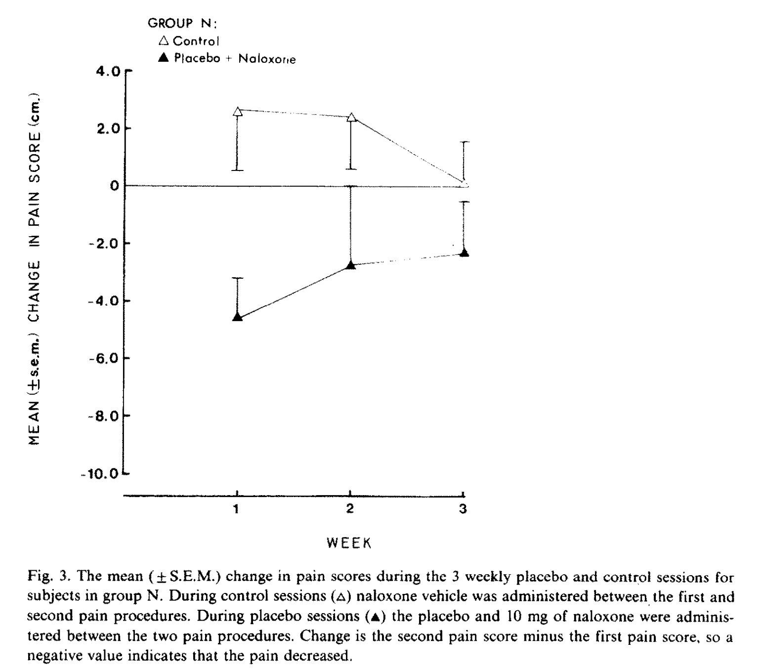 “The dependent variable is the change in pain score during the placebo session minus the change in pain score during the control session of the same week,” that is, (I think), not comparing pain scores, but comparing deltas of pain scores under different conditions. The authors assure us that the difference was statistically significant at p < .02. Therefore, we have our first (extremely confusing) non-Bernadetti result confirming that naloxone (slightly) reduces the (small) placebo effect.