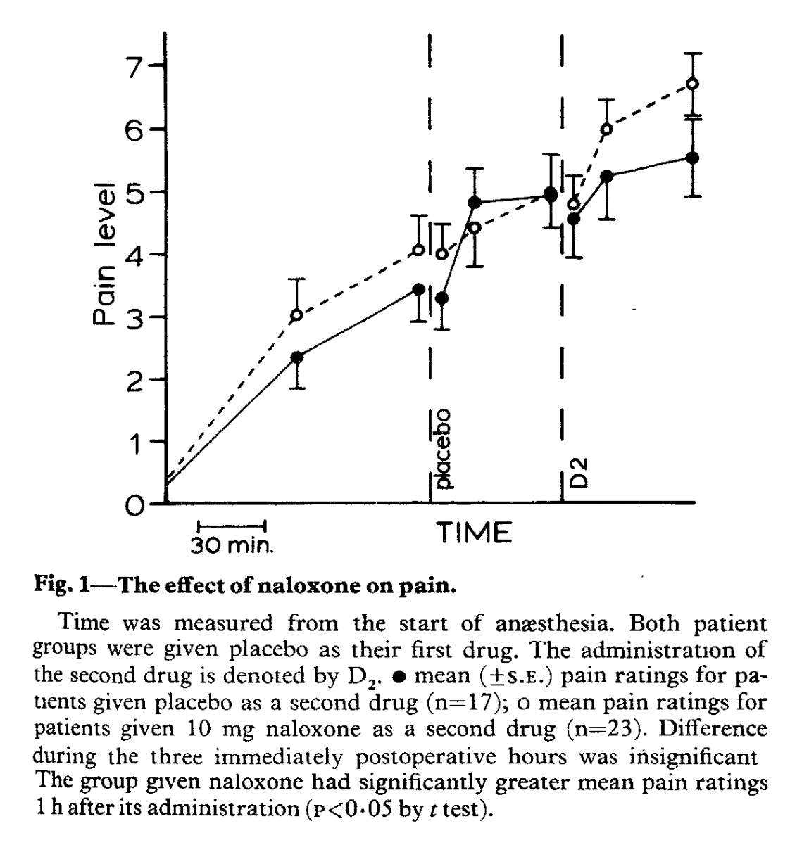 They find a significant difference in pain ratings one hour after the second drug administration that is significant at p < .05 and looks suspiciously similar to the pre-existing difference between groups before any injection occurred. They further break down the subjects into “placebo responders” (n=11) and “placebo non-responders” (n=6) and find that naloxone only reduces the placebo effect in placebo responders.