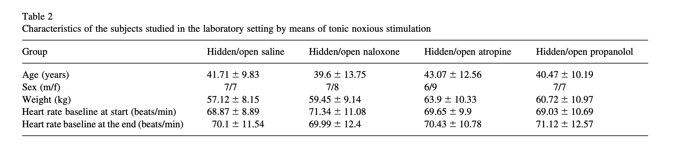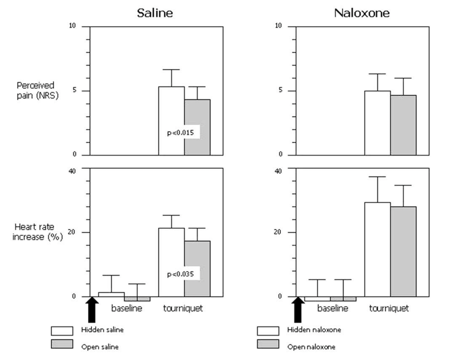 Now we have our last Benedetti paper, Pollo et al. 2003, Placebo analgesia and the heart. In the part of the study relevant to the meta-analysis, we are back to ischemic pain and tourniquets. They are using a pre-programmed infusion pump we just heard about for hidden injections. Each subject received either a hidden or an open injection. The groups relevant to us either got saline (hidden or open) or naloxone (hidden or open). Here are their results:
