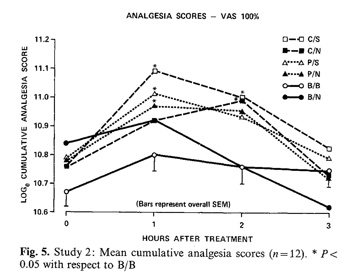 Interestingly, despite collecting seven measures of drug efficacy, the authors could not even find a significant difference between subjects administered codeine (an opioid drug) with naltrexone (an opioid antagonist) and subjects given codeine and placebo. They also did not find any significant difference on any measure between placebo-naloxone and placebo-placebo, our second negative result for our third non-Benedetti study. The authors put this down to small sample size, despite their groups being of similar size to other studies reported. One of the only significant results that they could pull out, other than that ibuprofen was superior to the other treatments, was that naltrexone “significantly increased (p < .05) ibuprofen’s duration of action,” but I suspect that is just noise.