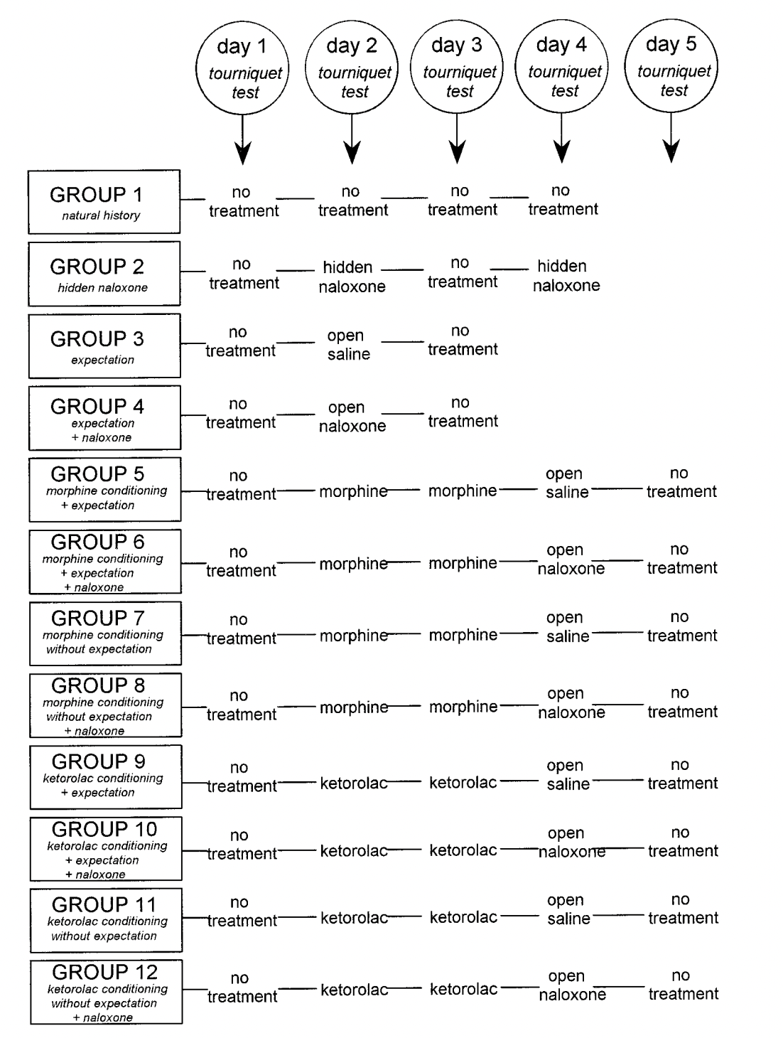 Group 7 is also compared to Group 10, who gets a hidden injection of the drug proglumide, a drug thought to increase the effects of opiates:
