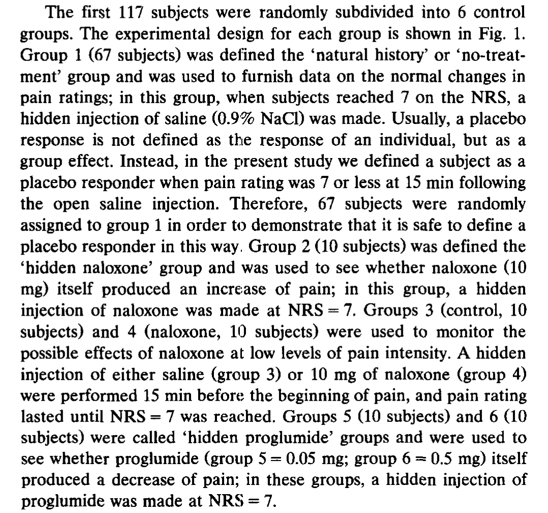 - Control groups of 56 and 25 that are not relevant to the naloxone reduction of placebo effect.