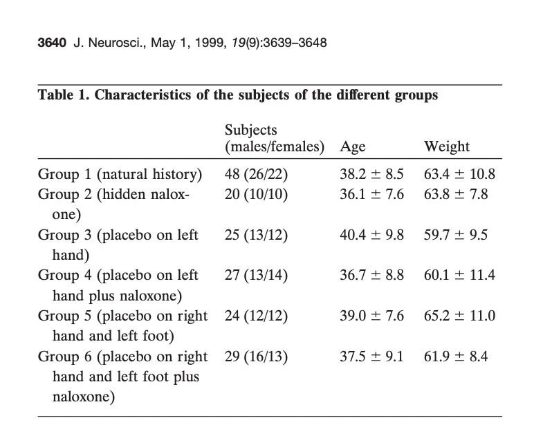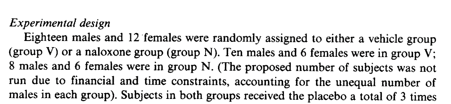 The authors also had a group of 20 subjects who received lidocaine cream rather than placebo, “to allow the double-blind design.” Unfortunately, the “natural history” control group is not reported to receive any kind of cream, so the “placebo effect” was that not just of suggestion of powerful pain relief, but whatever the cream itself may have contributed. Again, there was no effect of naloxone on the non-cream-treated natural history control group.