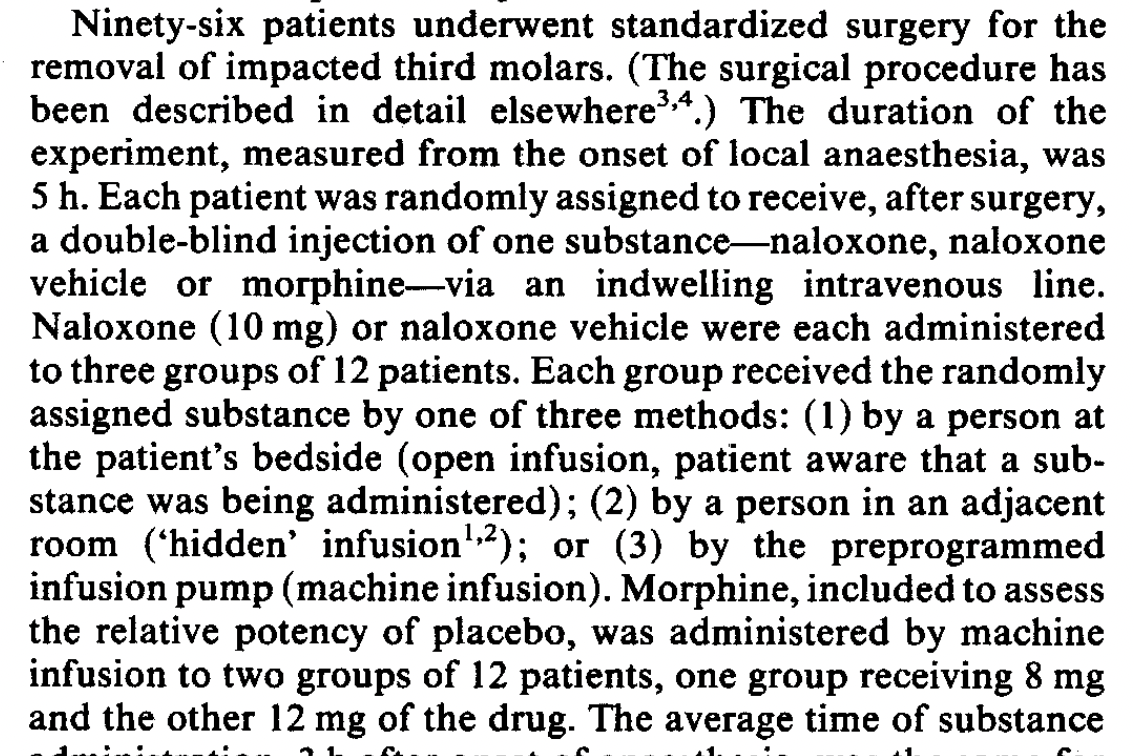 Next we have another study by the same team, Levine and Gordon (1984), Influence of the method of drug administration on analgesic response. They are embracing technology in yet another study of impacted molar surgery patients, comparing open injections, hidden injections by a human, and hidden injections by a programmable robot syringe pump. Each method was used for two substances: naloxone and a placebo. Morphine was injected by the robot machine in two doses as a comparison.