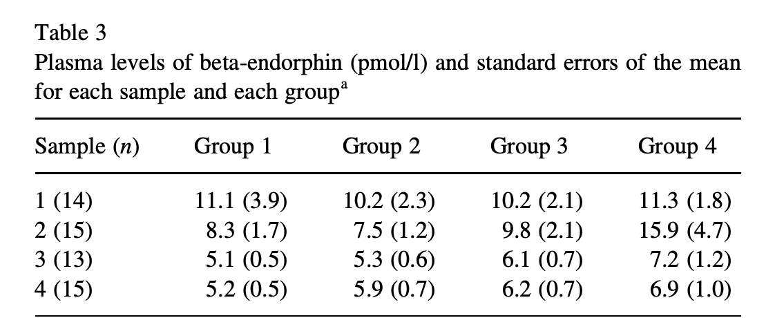 Finally, we have Roelofs et al. (2000), Expectations of analgesia do not affect spinal nociceptive R-III reflex activity: an experimental study into the mechanism of placebo-induced analgesia. As far as I can tell, this study is the only one to actually measure β-endorphins, which are supposed to be the whole point of this exercise. Sauro and Greenberg (2005) say that two studies did: