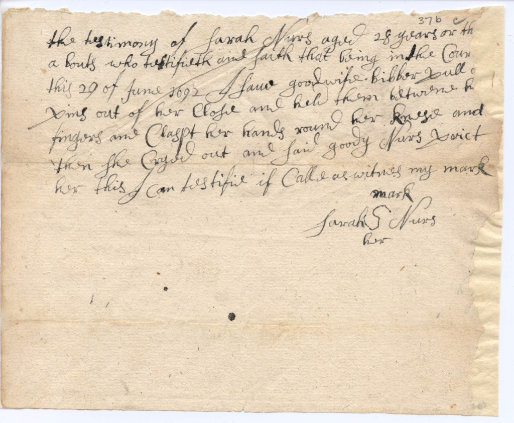 The same fraudulence and collusion detectable in the behavior of Mercy Short and Margaret Rule is also clear from the records of the Salem accusers. In addition to the rope trick mentioned above, here is the original handwritten testimony of Sarah Nurse regarding the poorly-executed magic trick attempted by Sarah Bibber, accusing Bibber of hiding pins and sticking herself with them to pretend to be afflicted: